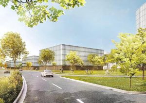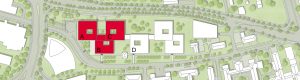 Der Neubau bildet den nordöstlichen Abschluss des Klinikareals und ist im südlichen Bereich an die zukünftige Campusmagistrale angebunden. Er setzt sich aus zwei ineinandergreifenden, ringförmigen Teilkomplexen zusammen, die jeweils einen vom Vorplatz zugänglichen Innenhof umschließen. Diese Teilung weist auf dieTrennung zwischen den Forschungsflächen im nördlichen und dem Zentrum für medizinische Mikrobiologie, Virologie und Hygiene im südlichen Gebäudeteil hin.